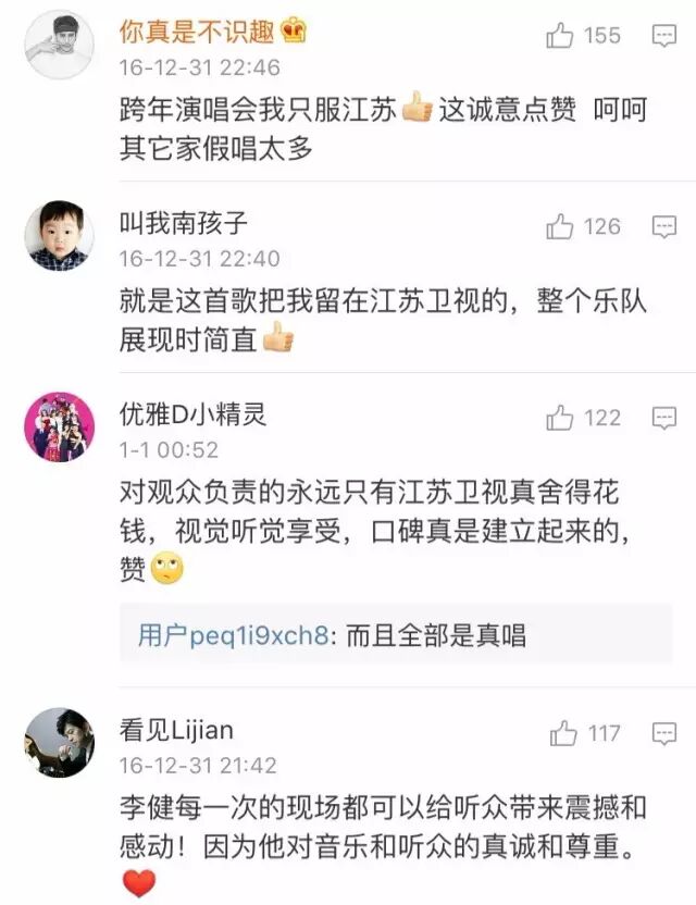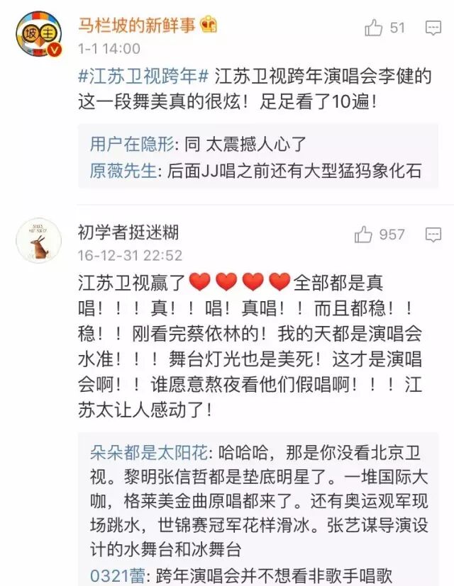 不知道大家意下如何呢?最后想问一下,最喜欢哪个卫视的跨年演唱会?最喜欢哪个明星的现场?最爱江苏卫视李宇春的演唱哦!