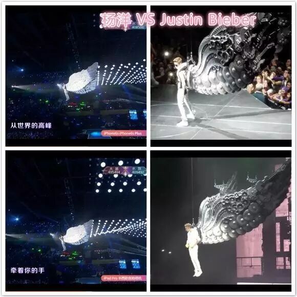另外,杨洋的翅膀造型照搬自贾斯汀比伯的演唱会造型,白衣白翅膀吊威亚出场(好歹换个颜色啊,抄袭也不懂脑筋)。