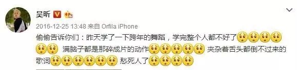 之前圣诞节时候,吴昕还在感叹舞蹈难学。看得出来,其中辛苦、努力的成分占据了主要部分。为了这场晚会,吴昕既当主持人,又要表演,辛苦程度可想而知。