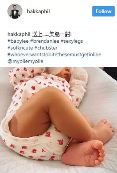 1日晚,Phil 在Instagram上贴出儿子Brendan 睡觉的照片,他特别特写儿子的双腿写到,“送上……美腿一对!” 瞧着双肉腿,看得网友们都留言称,“超可爱!求多分享一些Brendan的照片。”、“小宝宝的脚丫子是最可爱的~”、“一对小肥腿~”等。
