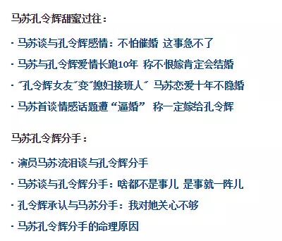直到2013年,马苏泪洒发布会,承认分手,孔令辉也在微博发表长文证实情变,并回应分手原因是:各自忙于事业发展,聚少离多,对马苏关心与沟通不够。