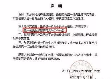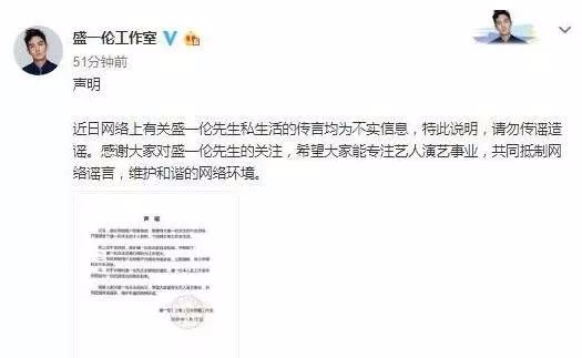 工作室态度明确,郑重声明说网上对于盛一伦的传言,都是虚假的,都是不实传言,希望大家不要相信。而且还强调说,盛一伦的所有行程,都是和工作相关的,并不是外界传的那样。