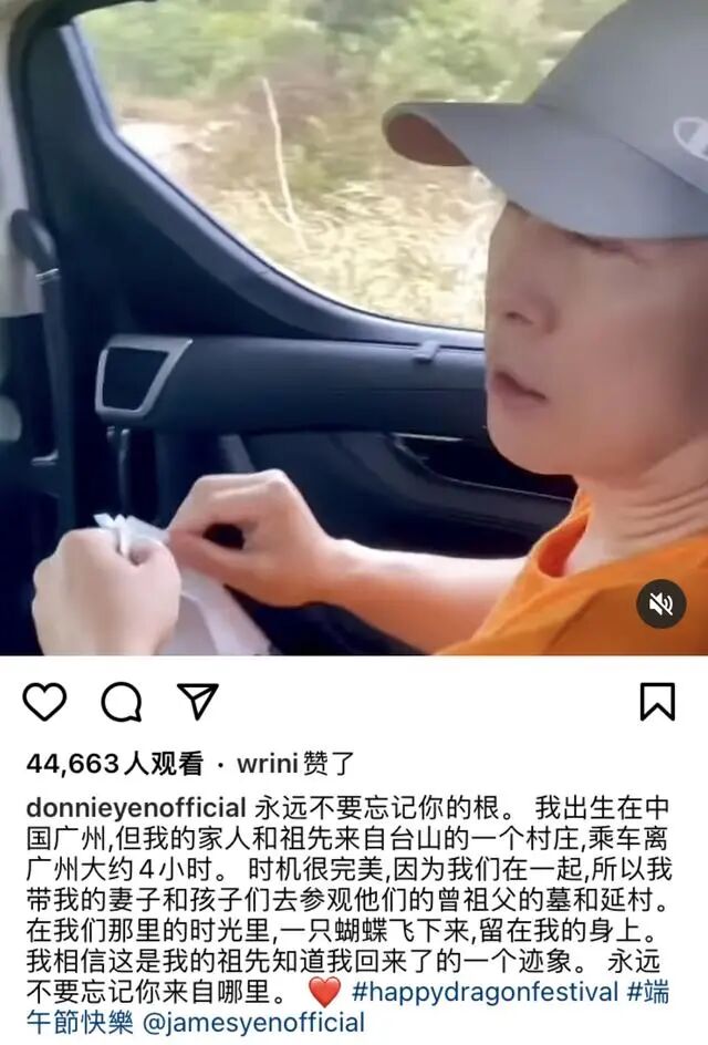 现年58岁的甄子丹这大半年来一直在内地工作,而他的妻子汪诗诗也一直随着他在内地,照顾他的起居。颇为意外的是,甄子丹与汪诗诗的一对子女这一次也随着父母在内地生活,一家人四处游览,先后在云南、浙江、广东现身,游览祖国的大好河山。端午节这一天甄子丹趁着妻子、孩子都在身边,并且一家人都在广州,于是就带着妻儿展开了一趟寻根之旅,全家一同返回家乡祭祖。他将寻根祭祖的视频在社交平台上公开,并且一再强调,永远不要忘记你的根源,永远不要忘记你来自哪里。