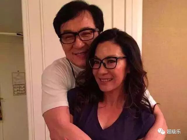 成龙与杨紫琼,而照片中成龙从后面紧搂杨紫琼,两人尽显亲密,二人也都是面带笑容。