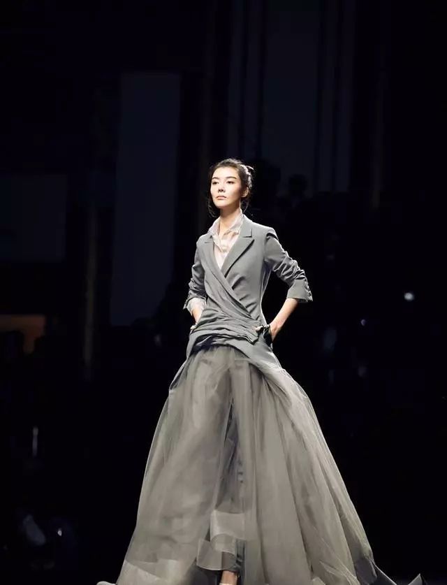 车晓首次走秀就委以开场model的重任,大秀现场。车晓身穿设计师为其量身定制的浅灰色“婚纱+礼服”成衣,礼服的细节利用了哥特元素的蕾丝以及超大褶皱,整体效果安静悲壮却绚丽!很有女王范。