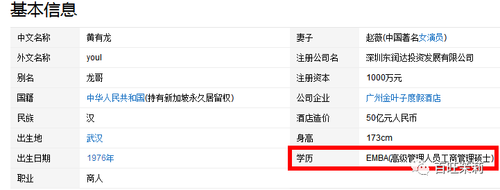 他资料里还写了学历是EMBA硕士,但是哪个学校都没说,网上也没有别的资料证明这个硕士,事实上EMBA根本就不算神马正经学历