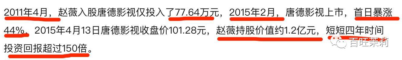 等到2015年唐德影视登陆创业板,赵薇持股市值已暴涨为1.2亿元,短短4年投资回报超过150倍!!