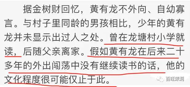 根据媒体的推测,如果黄有龙在后来二十多年的外出闯荡中没有继续读书的话,他的文化程度很可能就是只有这个黄塘小学了?