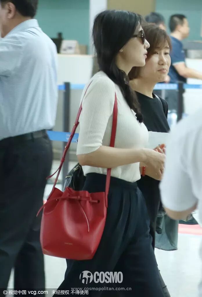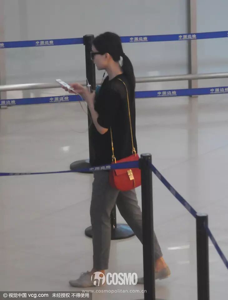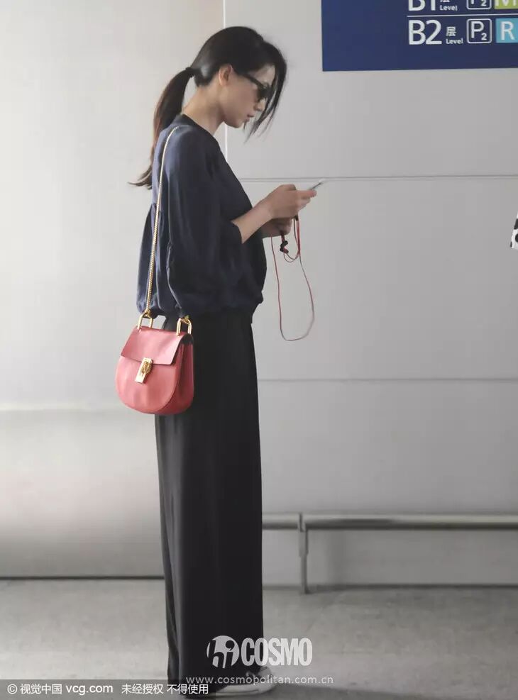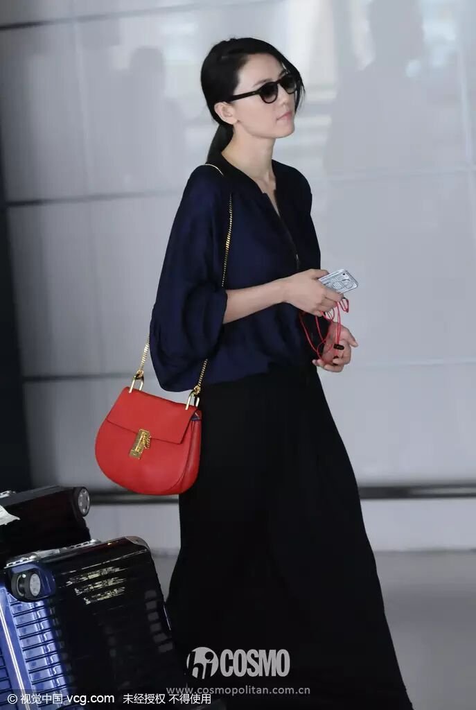 高圆圆这只红色的经典款小猪包也是她的机场街拍中出现过很多次的,红色又萌又少女,而且搭配深色系的衣服更加抢眼。