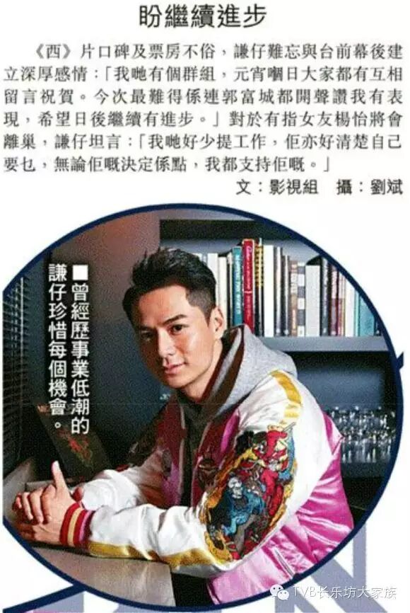 《西》片口碑及票房不俗,謙仔難忘與台前幕後建立深厚感情:「我哋有個群組,元宵嗰日大家都有互相留言祝賀。今次最難得係連郭富城都開聲讚我有表現,希望日後繼續有進步。」對於有指女友楊怡將會離巢,謙仔坦言:「我哋好少提工作,佢亦好清楚自己要乜,無論佢嘅決定係點,我都支持佢嘅。」