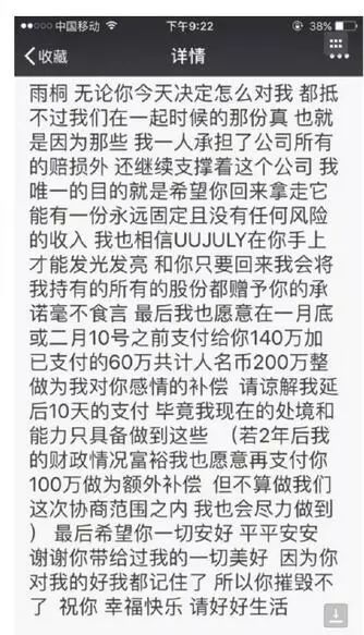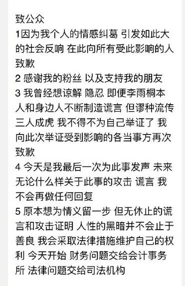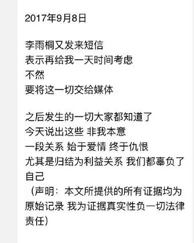 10、2017年9月,李雨桐再次发短信给薛之谦威胁要求,否则就交给媒体。此后,李雨桐就开始大面积爆料。