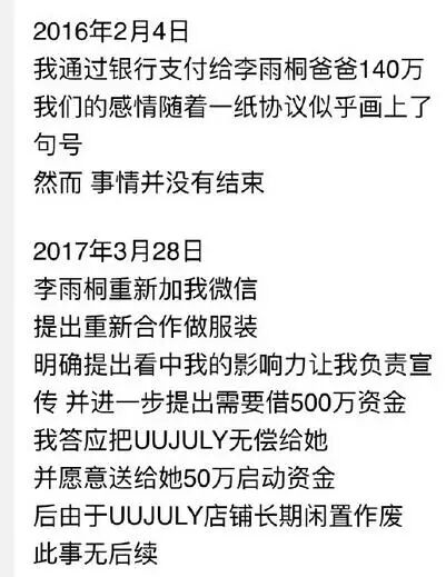 8、2017年3月,李雨桐再次联系薛之谦,提出再次合作,向薛借500万,此事无下文。