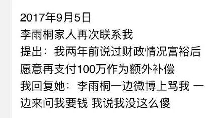 9、2017年9月,李雨桐家人联系薛之谦,要求其再赔偿100万,被薛拒绝。