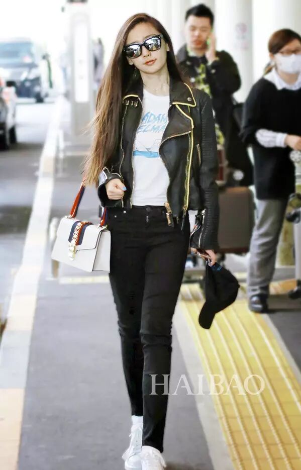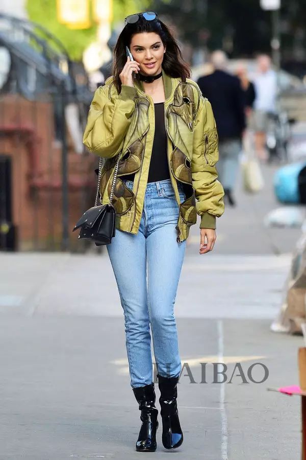 先用紧身连体内衣与浅浅水洗色牛仔裤勾勒高挑玲珑曲线带出性感,再以男装镂空飞行员夹克的廓形与硬挺的黑靴增添酷感,啃豆在娘与Man之间取得完美平衡!