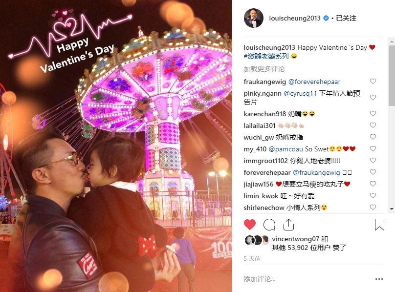 冧完今世情人,张继聪又发了一张与女儿亲嘴的照片祝大家情人节快乐,还搞笑留言说是“激嬲老婆系列”。