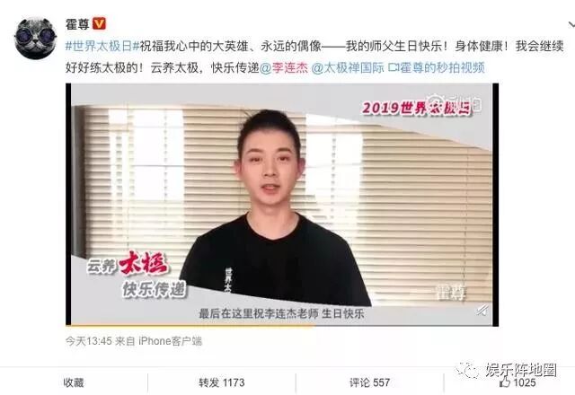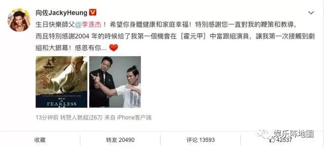 李连杰的徒弟向佐也在微博晒出了自己与李连杰的合照,除了送上生日祝福外,他还在微博写道:
