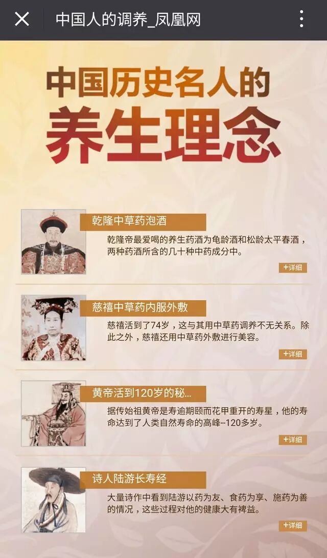 乾隆是中国历史上最长寿的皇帝,活到89岁;当时人们的平均寿命是38岁左右,慈禧活到73岁;始祖轩辕黄帝活到120岁,我们熟悉的《黄帝内经》就是记载着他的养生方法;南宋著名爱国诗人陆游,身逢乱世,一生坎坷,饱经风霜,却得高寿,且晚年依然耳清目明、身轻体健。想知道这些中国历史名人有什么养生秘诀吗?