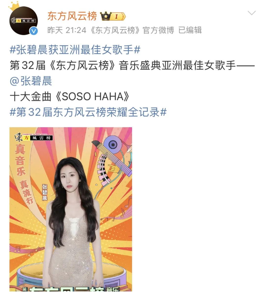 张碧晨发文称:又一年东方风云榜,感恩感谢,幸福和收获更多,未来还很远,咱们且行且珍惜且开心~