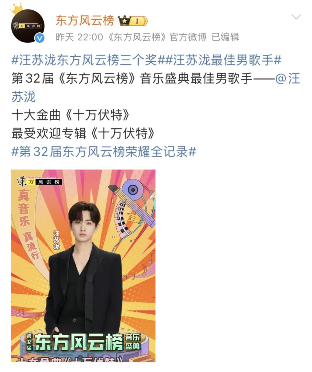 汪苏泷、张碧晨都曾获得《东方风云榜》颁发的奖项