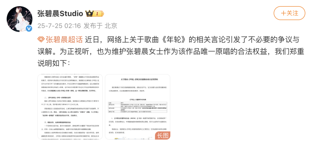 随后,张碧晨工作室发微博称:“张碧晨女士作为该作品唯一原唱”,并贴出相关证明材料和时间线。在该微博评论区,工作室称,值此《年轮》发行十周年之际,好好和这首作品告个别。