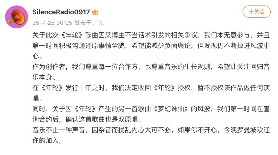 汪苏泷方发文称:“在《年轮》发行十年之时,我们决定收回《年轮》授权,暂不授权该作品做任何演唱。”