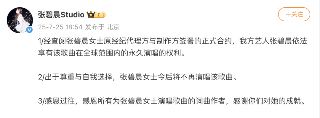 7月25日,@张碧晨Studio 发文回应:“1、经查阅张碧晨女士原经纪代理方与制作方签署的正式合约,我方艺人张碧晨依法享有该歌曲在全球范围内的永久演唱的权利。