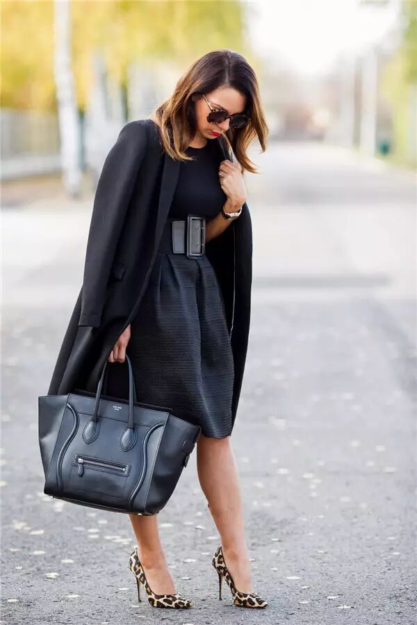 小女人味高腰A字裙加上宽腰带很好的提升了腰线,让腿部从视觉上无限延伸,内里针织毛衣外披一件西装保暖且有范儿!脚踏一双豹纹细高跟更是气场十足。