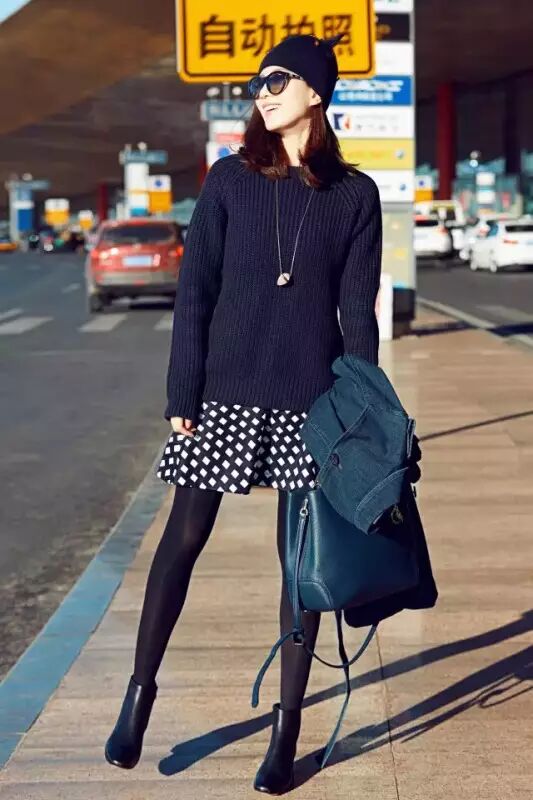 搭配针织毛衣的这种打扮换上A字长裙要更好看,而且你可以在里面穿上保暖的打底裤,是最温暖的搭配。