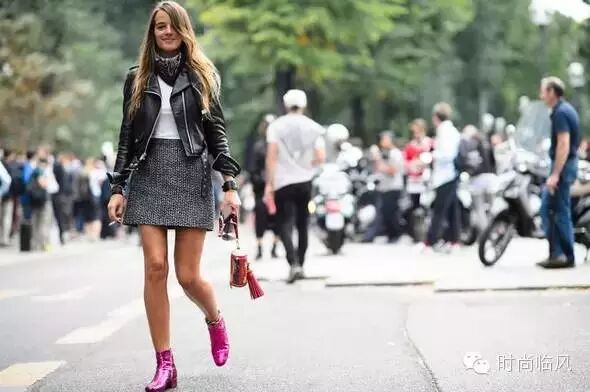 皮衣搭配A字裙摇滚感爆棚,玫红色的短靴更是全身的亮点。像皮革这种突出质感的单品融入造型,建议搭配简约纯色系单品,看上去更加充满个性。