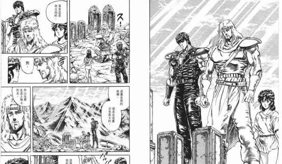 《北斗神拳》作为格斗类SF漫画的鼻祖,人物面部特征:高耸的鼻梁、深陷的眼窝,以及刚开始兴起的由瞳孔的缩放来表达人物内心活动的画法,令人们印象最深刻的那当然是刻画的丝丝入扣的肌肉线条。