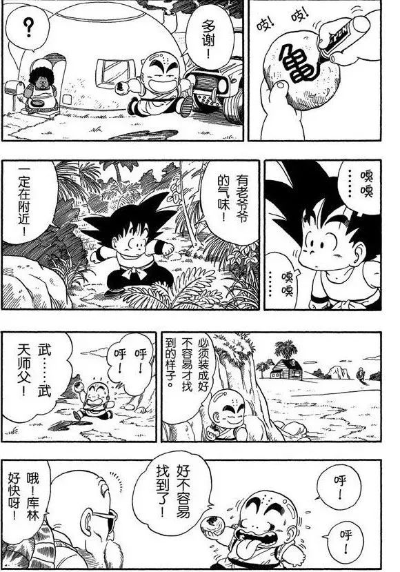 最开始鸟叔是想把《龙珠》做成搞笑漫画,所以画的轻松写意,主角队几乎全是Q版造型,脸部线条也非常简单,偶尔会出现暴肌肉的画面。比如龟仙人第一次放龟派气功的时候。