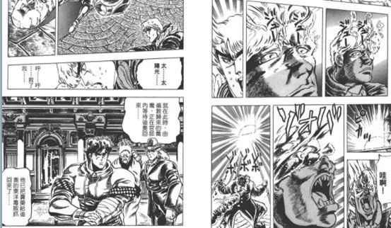 首先是大家很熟悉的着重描绘肌肉线条的格斗类漫画,其中以原哲夫的《北斗神拳》和荒木飞吕彦的《JOJO的奇妙冒险》为代表。