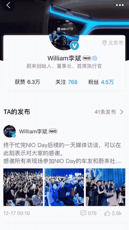 同样的,在蔚来App上,车主们也可以通过分享线上线下活动,交到一群志同道合的朋友。蔚来的老总们也活跃于App上,一有空就会看看大家在玩什么、聊什么、吐槽什么,并及时回复大家的关切。