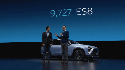 发布会现场,在李斌将第9727台蔚来ES8交付给小米创始人雷军之后……