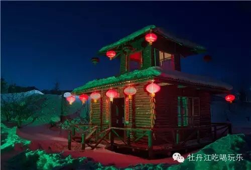 独具特色的为冰雪夜景,高高挂起的大红灯笼、镶嵌冰面上的彩灯、七彩灯塔上的光束、悬挂在松柏上的流苏灯、划破夜空的激光灯,影射出缤纷靓丽的色彩,妆扮了古朴的雪村……