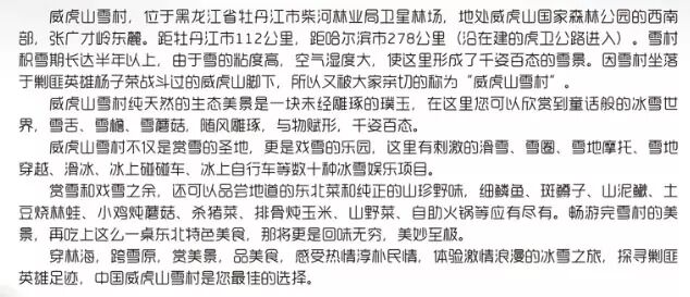 因为遥远,便多了一份神秘;因为传说中的美丽,便多了一份盼望;因为曾经的错过,便多了一份珍惜。威虎山雪村,冰雪旅游圣地,带您回到东北老家!