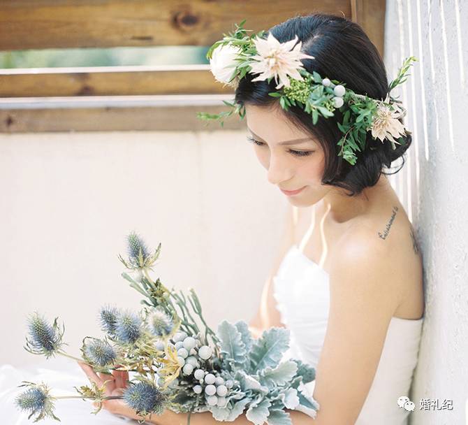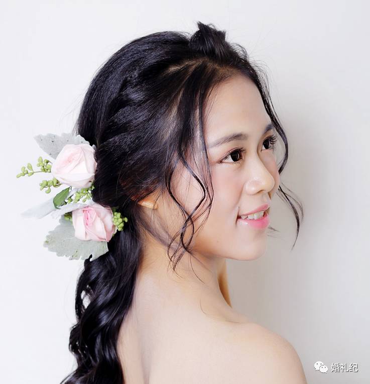 方脸的新娘,做盘发的时候可以把头发弄得凌乱,打破脸部方正的线条,转移直觉注意力。