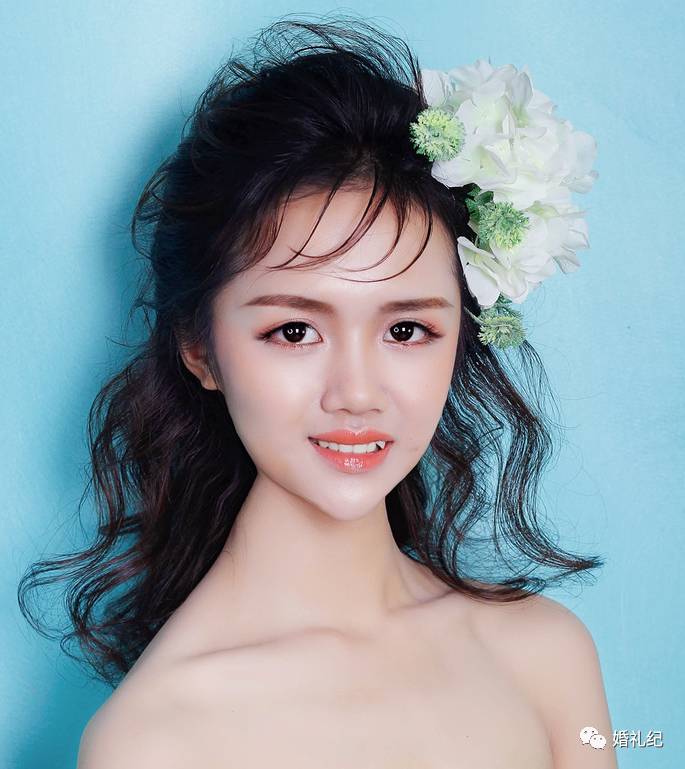 稍微有点蓬度的发型,可以很好的修饰五官的轮廓。婚礼当天让化妆师给你做个玉米烫或者直接做卷发。