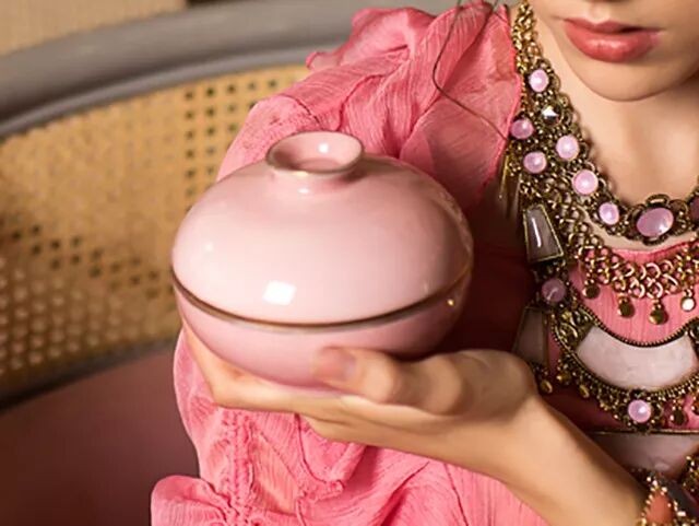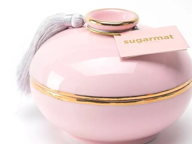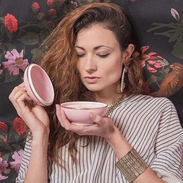 装着蜡烛的粉色陶罐,是Sugarmat设计师请中国景德镇的老手艺人手工烧制的,灵感源于中国古代容器和盖碗。