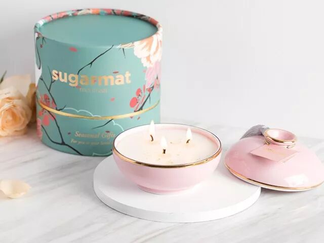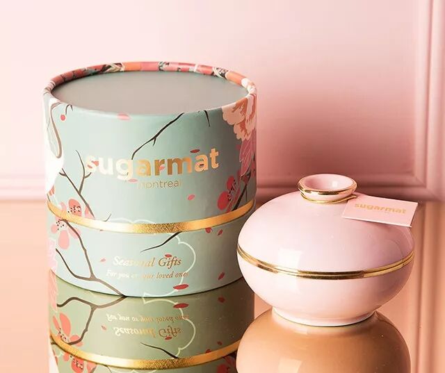 香薰蜡烛也有单独的圆筒形礼盒装着,盒子上有仙鹤樱花树印花。