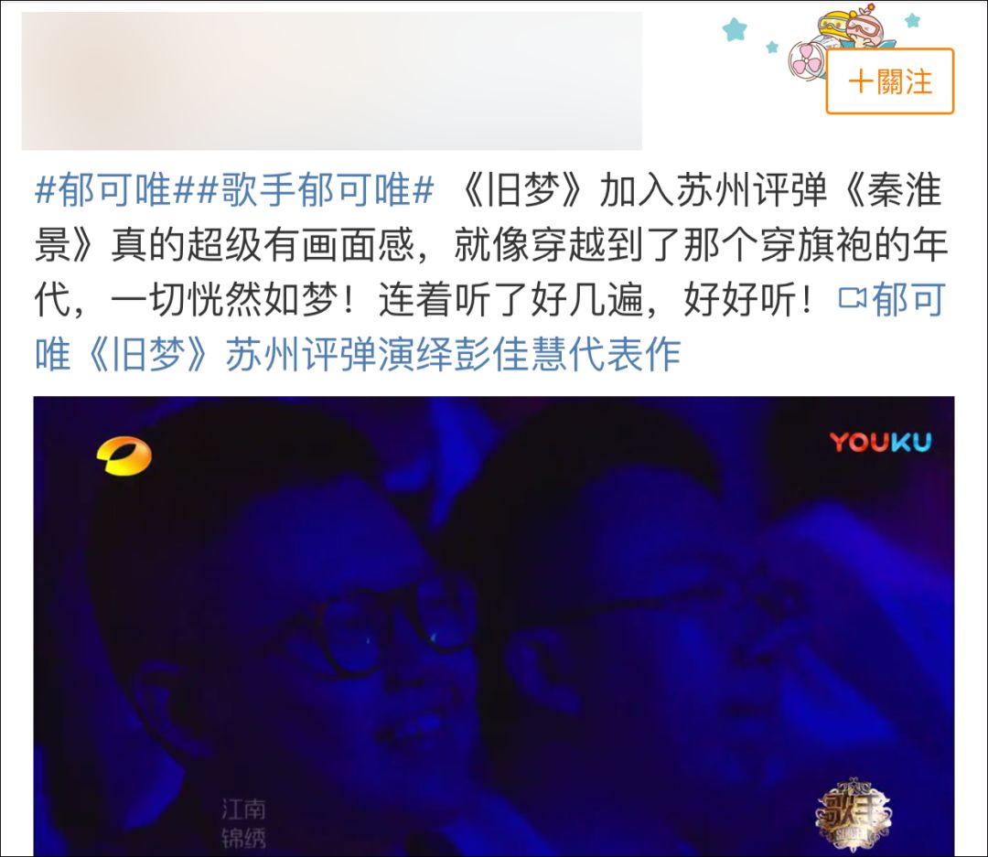 就在湖南卫视《歌手2018》3月30日那期节目中,郁可唯在彭佳慧的歌曲《旧梦》中融入了苏州评弹,完成了一次充满江南特色的表演。