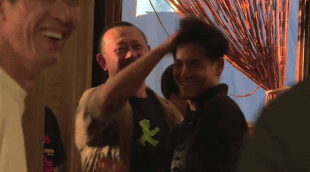 姜文在片场时,像摸小子一样摸他头。