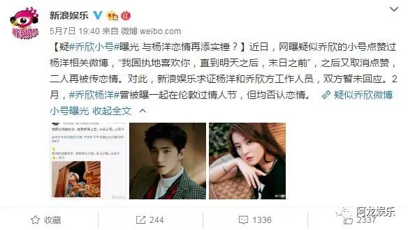 这件事情一度登顶热搜,大家都很关心杨洋与乔欣的恋情,故事的开头是杨洋在微博上发了一张自拍,细心的网友顺着水印发现了杨洋的小号,对此本尊回应只是微博的BUG,但大家并不太相信这种借口。