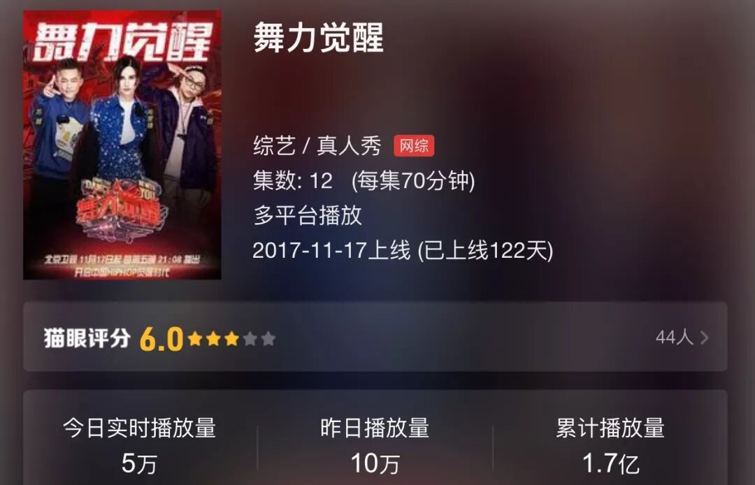 单期节目数据《舞力觉醒》也不容乐观,首期节目在腾讯视频上播放量为405万,而《这!就是街舞》的首期节目在优酷视频上播放量高达4274万。
