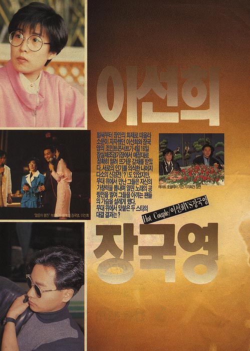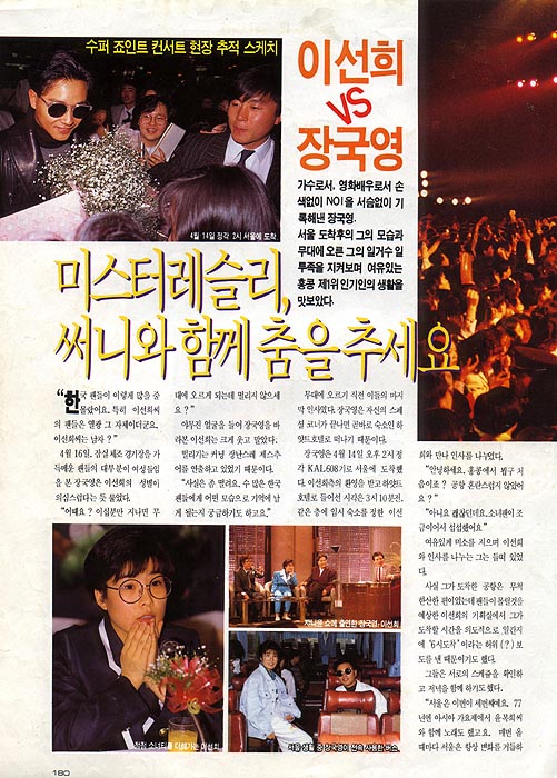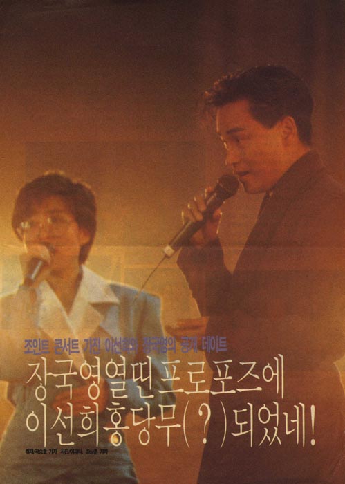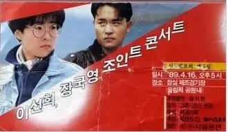 1989年4月16日,张国荣应邀担任韩国人气歌手李善姬(亦译李仙姬)的演唱会嘉宾,演唱了《贴身》《奔向未来日子》《够了》《无心睡眠》等歌曲,并与李善姬合唱韩文歌《致J》,足足20分钟演出,光芒万丈的舞台魅力令韩国歌迷疯狂至极。(感谢@跳舞的转子 翻译)