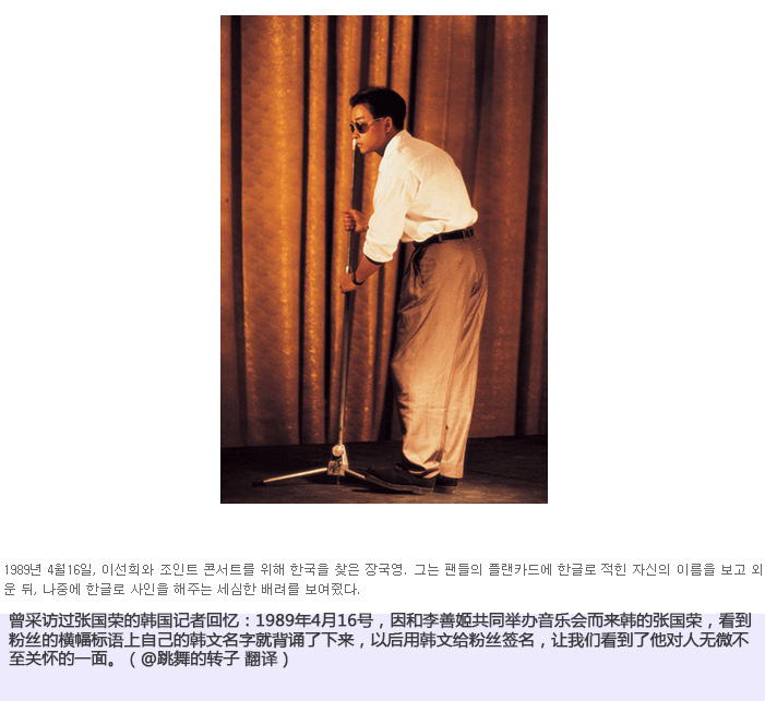 曾采访过张国荣的记者回忆:1989年4月16号,因和李善姬共同举办音乐会而来韩的张国荣,看到粉丝的横幅标语上自己的韩文名字就背诵了下来,然后用韩文给粉丝签名,让我们看到了他对人无微不至关怀的一面。(@跳舞的转子 翻译)