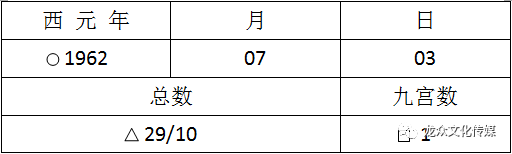国际巨星汤姆克鲁斯的生日是民国51年7月3日,转换成西元纪年为(1911+民国51年)7月3日,所以汤姆克鲁斯的西元生日,就是1962年07月03日。九宫数运算式:(月、日如果是个位数,前面十位数补零)然后将西元年月日的数字逐一个别加总到个位数