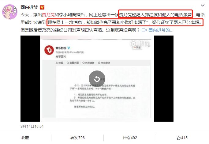 而且当天下午jnl经纪公司童乐影视就发了声明称“贾乃亮和李小璐在民政局办理离婚手续”一系列消息及新闻均为不实内容。