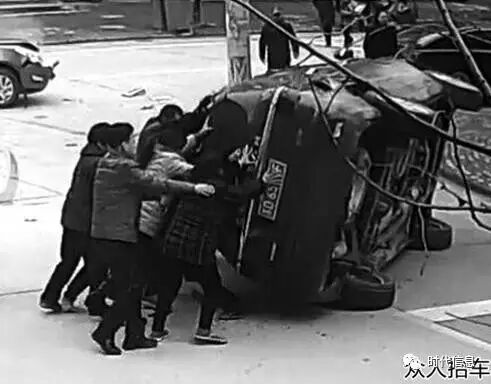 1、两车相撞侧翻车内娃娃哭 十余路人齐抬车