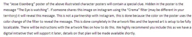杰西·艾森伯格的人物插画中隐藏着一个特殊线索,需要将图片分享到Instagram上使用“Crema”滤镜才能看到。不不,我们真的不是软广,没有!完全!绝对不是!在跟Instagram搞合作,相信我们,这只是一个意外,我们爱死了这个巧合,可是又不得不通过别的软件……算了不解释了,就酱,你们快去看吧。